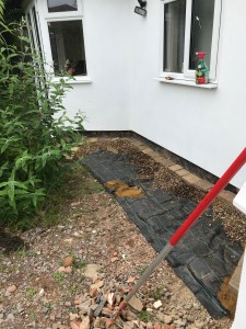 There is enough gravel to do a couple of different areas. I’ve sprayed with glyphosphate weed killer under the barrier membrane as I’ve seen how easily couch grass grows through it. This area will be good for pot plants and possibly the planters we have scattered around for want of a proper design.