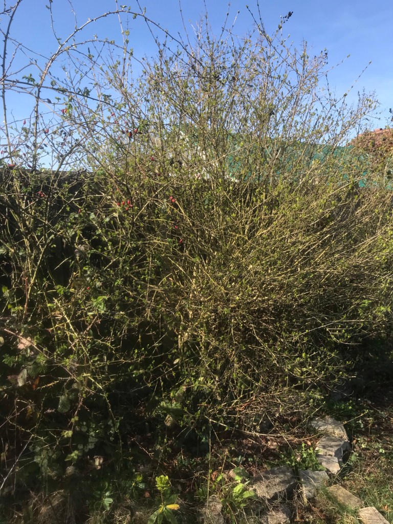 I did a lot of this last year when I wasn’t pulling dandelions and couch grass and other nasties. This area behind an area eldest was going to tend has gone a bit ramshackle. And worse there are brambles and wild roses growing rather furiously through the shrubs which are spiky. Lots of spiky from the previous owners…
