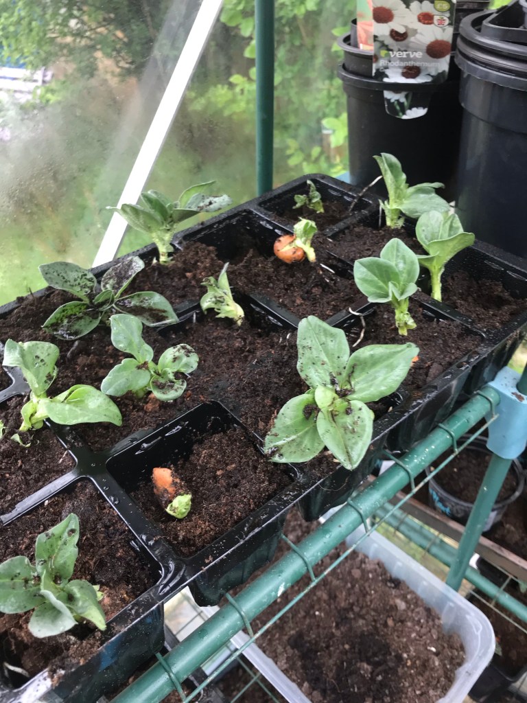 I told you I’ve only had my greenhouse since last year. It was free cycled or similar for £40. I’ve never grown broad beans before and spurred on by the balmy weather of the last couple of days I headed out to transplant my broad beans. I’ve put some into individual pots and others have gone outside. And I’ve come in to escape the cold! Yes it’s turned on me.