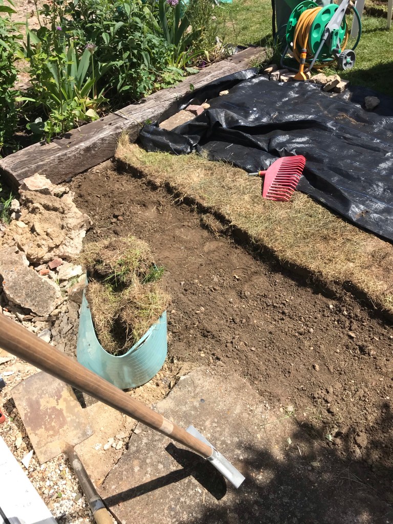 I felt like a better idea today was to take it a little bit at a time to take the grass up. It’s about a slab width now. Two or three more to go! I am not laying them six by four exactly as I want to leave one or two squares for plants. It will be random!