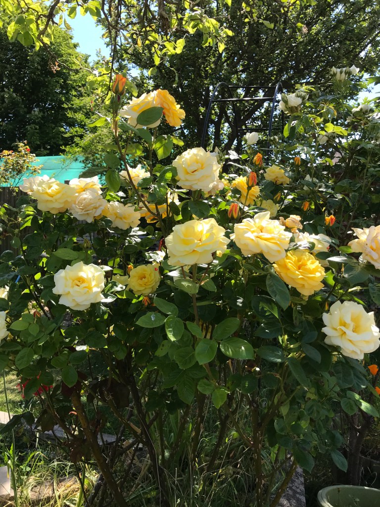 Lots still to do and I know it’s going to be hard. I’ve tried videos and panoramic pics but then the platform is changing and I need to keep abreast of that. The Apple blossom has all blown away, the lilies are promising an appearance but areas where daffodils and Scilla grow like mad take a long time to recover. The roses look beautiful where we have trimmed them back but we have lost some to the sky which we didn’t prune at all.