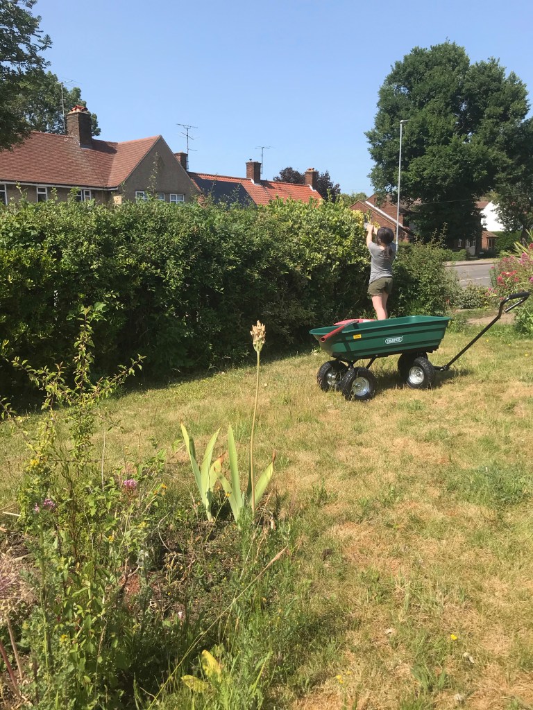 Thursday is our garden collection day and the grass cuttings are rather pungent. But adding a load of other weeds today made the front garden a little tidier. Little one didn’t get up to the top of the hedge but thoroughly enjoyed using my new hedge gadget and my new tipper cart. I have to do a little more digging and soil shifting to lay out the slabs I want, and we have to order a tonne of sand and some lime cement to lay the slabs properly. I am not a big strong builder and neither are the rest of the family, so we may be a while getting the slabs laid. Oh well…
