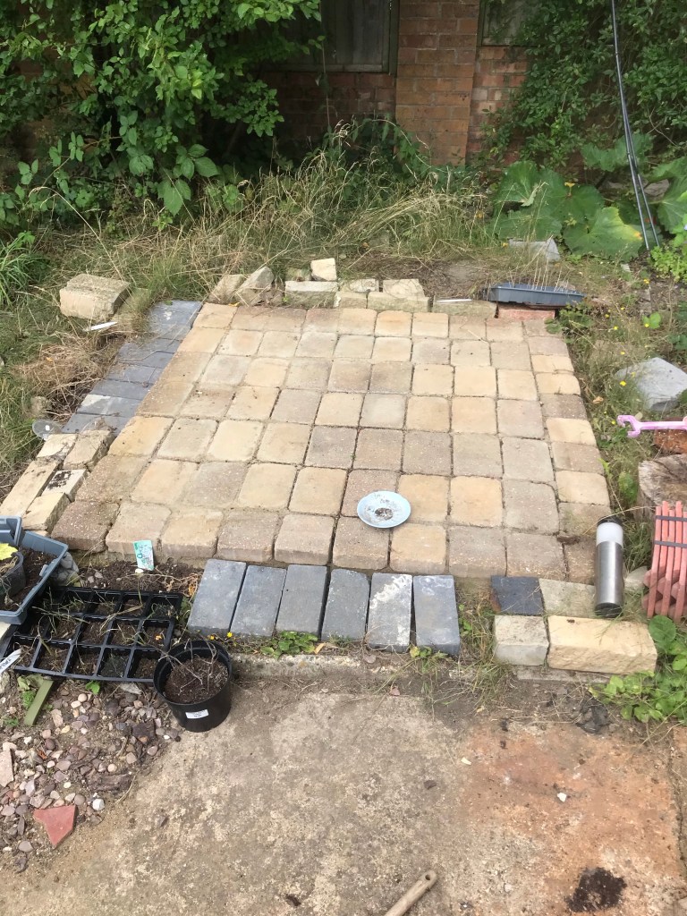 But we have a paved area where the greenhouse was which can now be a little patio outside the shed in progress? It was made with some lovely little paviors I got through free cycle. And a little sitting area is much better use of this sun trap.