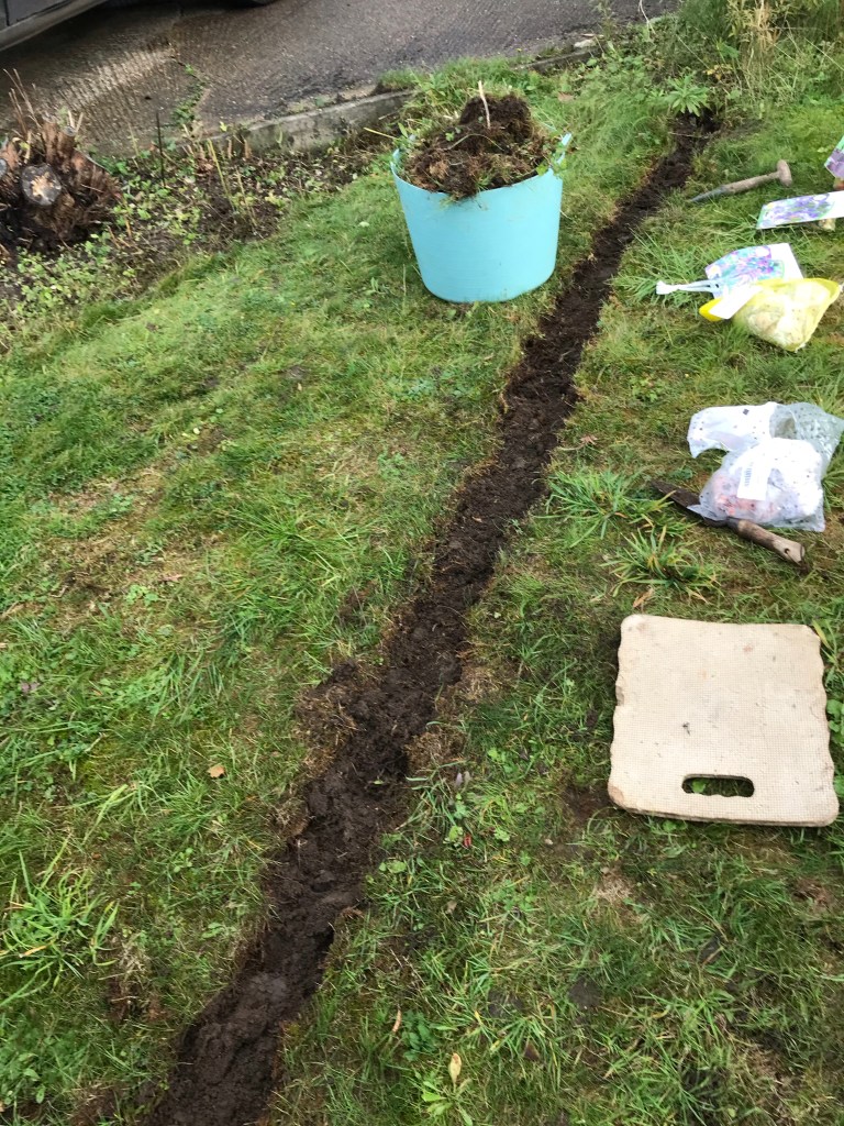 I started off digging a trench for tulips in the front garden and I dug a ten centimetre trench. It defines the area to the left which must remain garden and we had intended to make into driveway if we had the funds… (I need a job!)