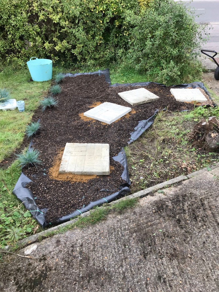 The grass was largely moss and plants I don’t want. Not grass at all. So I covered an area with weed barrier and used the bags of peagravel we got from my friend. It had a lot of compost mixed in so I’ve used that on the area of weed barrier and I planted some of my festuca glauca plants down the edge.