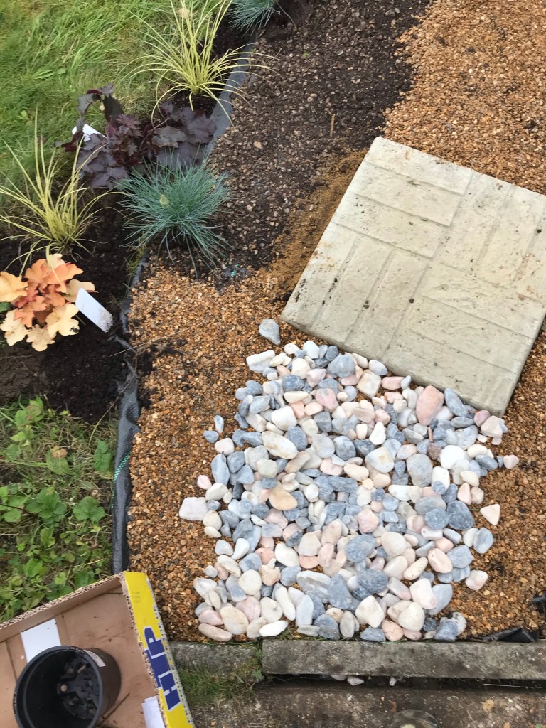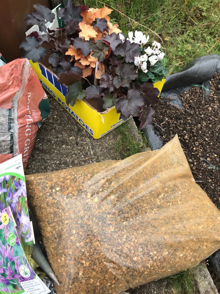The existing flower bed with the tree stump was covered in snails. I am hoping by mulching it with horticultural grit and compost it will become less attractive to the slimy creatures but I suspect I may need to clear them a lot. I might start collecting egg shells to dry out and scatter. The garden could do with fewer snails if we can. They eat a lot of my favourites – they may be the culprits of munching my missing Japanese anemones… And there is still some things growing round the stump which need eradicating. Another day tomorrow…