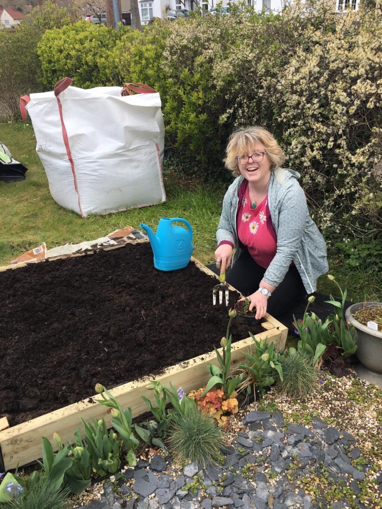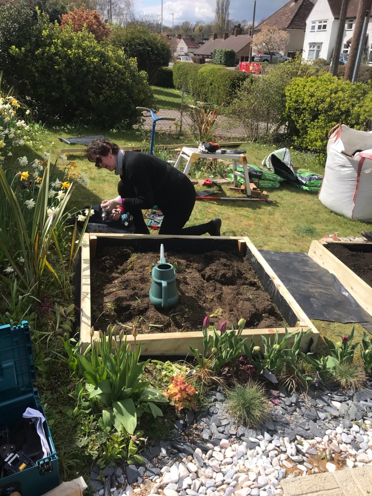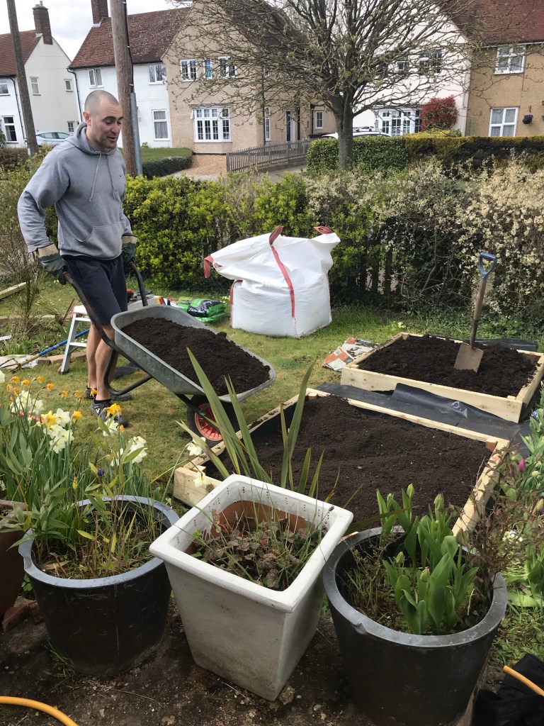 We have two enormous veg beds in our front garden! A lorry delivered a bag of topsoil and with four bags of manure mixed in we are able to start planting!
