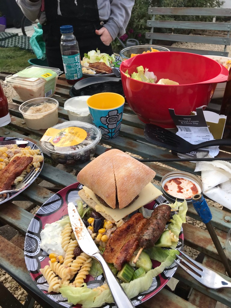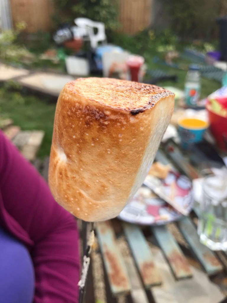 We now have a place for our rusty looking table and chairs and bbq which doesn’t mean decamping to the other side of the garden. And it was warm enough to sit out toasting enormous marshmallows until 7pm. Our meal involved hitting Iceland (less busy than a supermarket in the end of lockdown week) and getting bbq staples. ‘Twas jolly tasty! And we finished off toasting giant marshmallows but we forgot skewers so it was so share a kebab skewer! (We could only find one. One marshmallow was sacrificed to the fire to see how well it burned! Which was a heck of a lot! I had one perfectly toasted marshmallow as I went last with the skewer… yum!