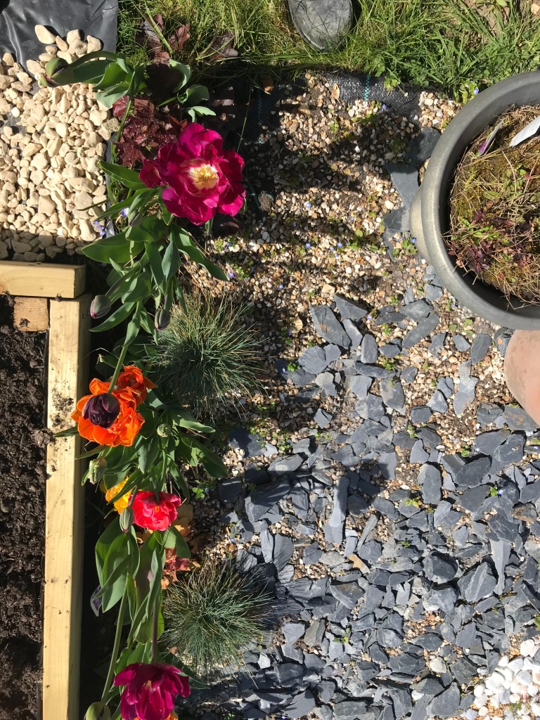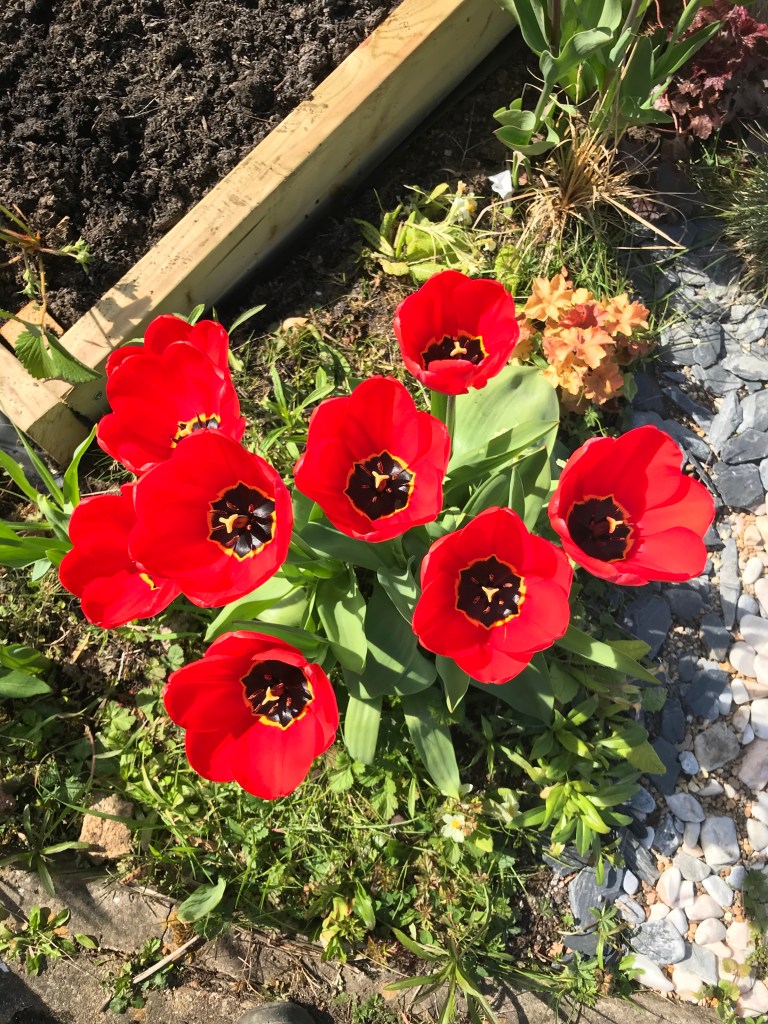 Hope you enjoy my flowers! The front has almost lost all the yellow daffodils. And the back has a lot of little blue flowers with bright red tulips. I still haven’t spotted blue tulips which I bought a lot of over the past couple of years. Where are they? I still want to change things but our shed plans have come to a halt until we work out whether the shed is going to be a large one needing permission or two smaller ones.