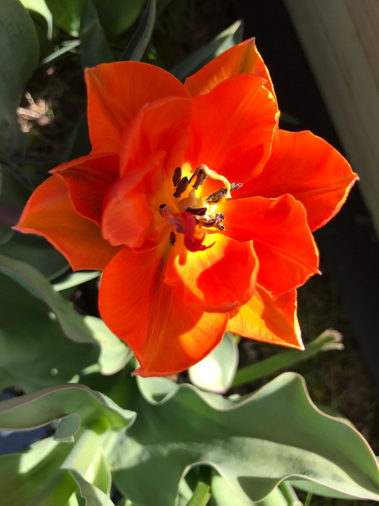 Sometimes I can’t think to blog. I’ve tired myself out with a couple of work shifts, which weren’t overly taxing but didn’t go smoothly. I’ve watered my veg beds but it is true they are drinking lots. I may have to water before the sun comes out as well as after. I have taken quite a few pictures of the tulips which are out. The ones that are kind of blouson were the more expensive purchases last year (but still not over-expensive) and may need resiting after they bloom if I am to have a path between my Veg Beds.