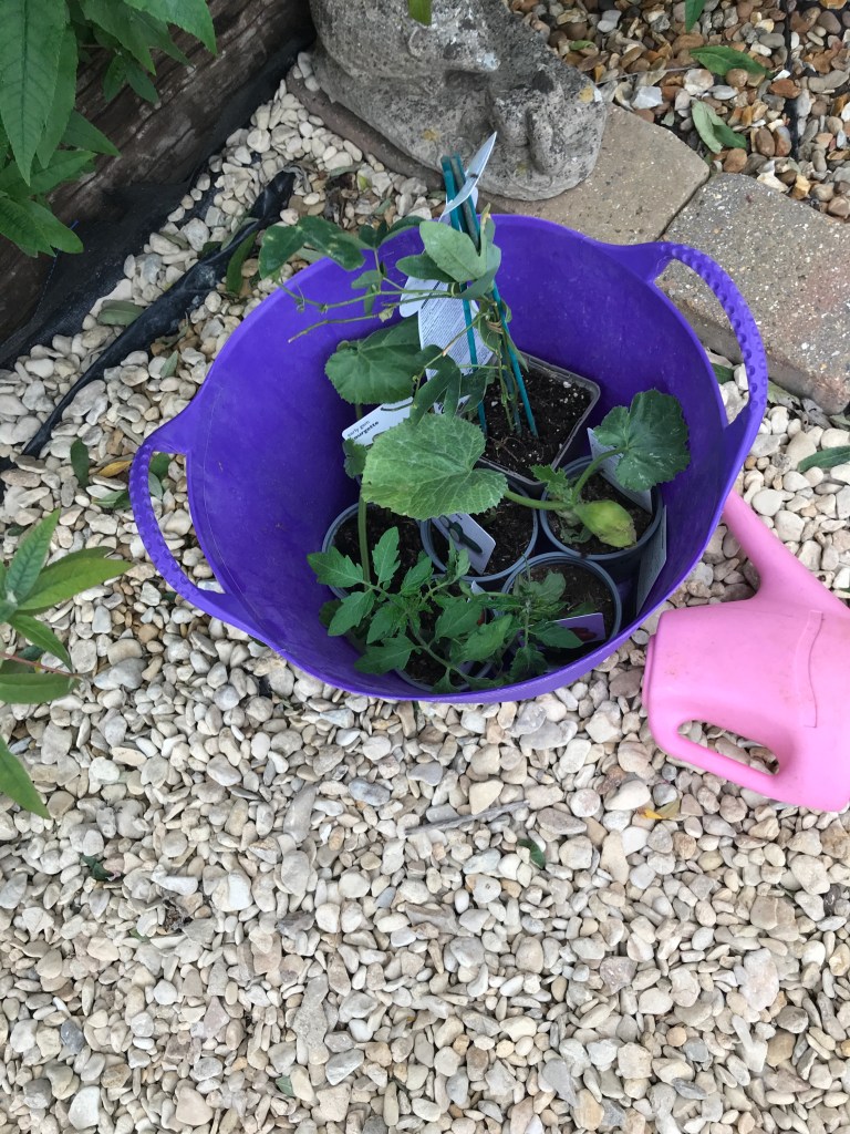 I’ve planted lots of things! From cineraria and thyme to strawberries and verbena Sparkle Blues, to oregano and lemon balm. The trugs are flanking both sides of the greenhouse path in an attempt to stop the brick edging from moving when people (and dogs) take short cuts.