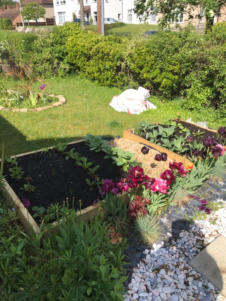 The tulips are amazing but near the end. I shall dig up the central ones so we have a path for the beds. Exciting to see alliums shooting up, and flowering where I weeded. Rain came on. I blog!