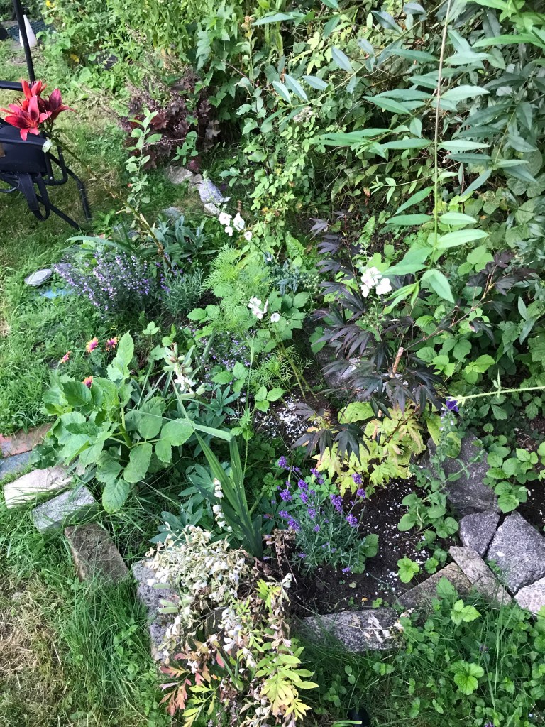 It’s horribly sticky tonight! July’s late heatwave is continuing and I figured I’d continue weeding the bed I’d left to my youngest. Getting further back I’ve realised these weeds actually stink! Not smell a bit but stink! I think they are wild geraniums and boy, I was sweating and starting to feel really sick. I started on Sunday night but I can see this one failing my ‘can do’ attitude. The claw I have was helping to pull it off in chunks but it was leaving behind a lot too! I have plants to get in the ground but I fear this one might take too long/take too much energy from me.
