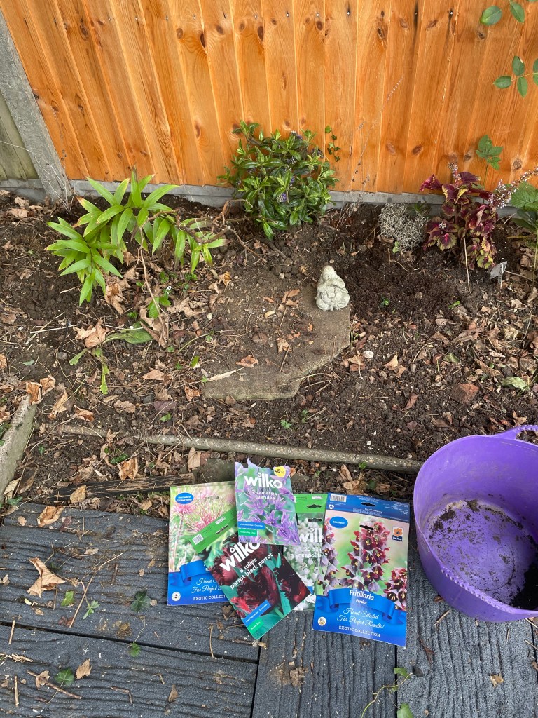 I’ve enjoyed the last hour pulling out more ivy and euphorbia and planting snowdrop and alliums of all different types. A couple of camassias and a sprinkling of the dog’s ashes all add to the peaty enrichment of the soil. Let’s see what makes it through the winter!
