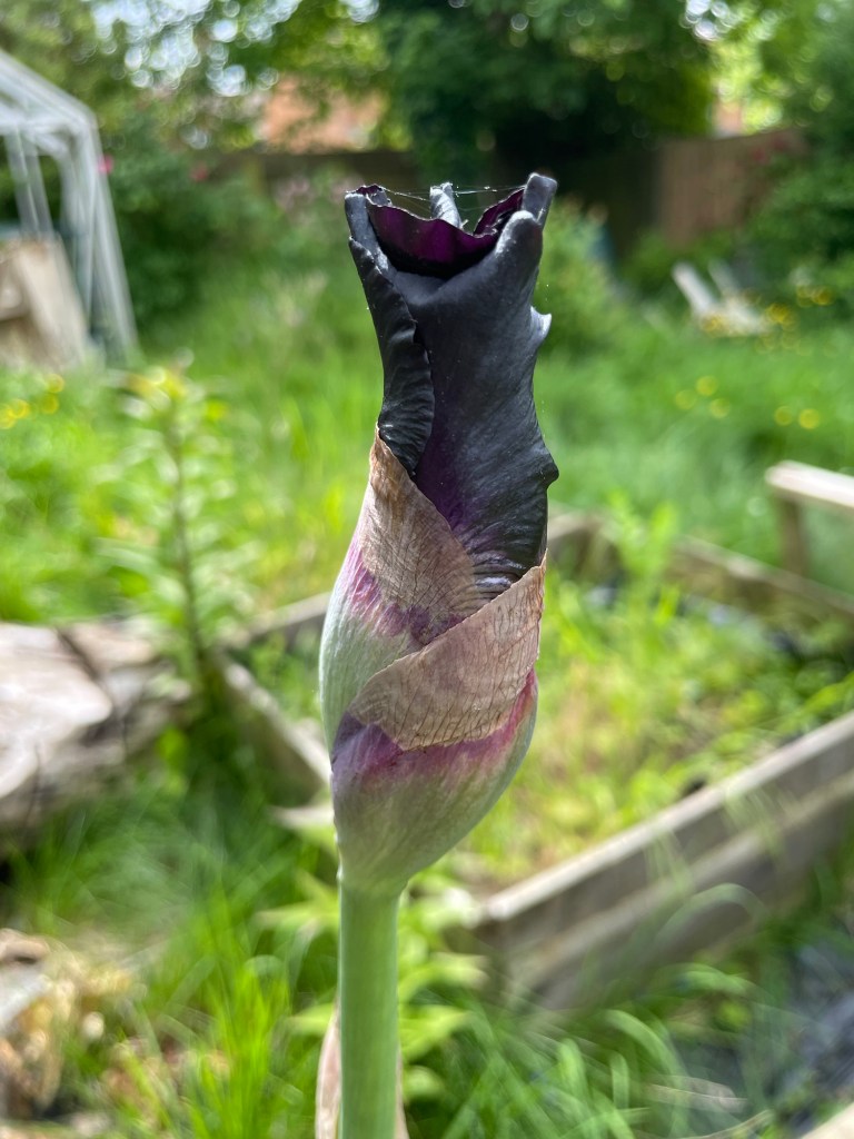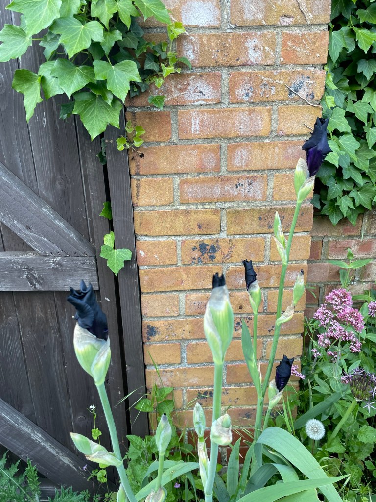 The irises I’ve chosen are largely dark blue almost black. This contrasts with the pinks purples and oranges I’ve dotted about. Californian poppies are vivid orange and before blooming they are peculiar beige green funnels. I often think a poppy plant has disappeared but there are lots about to bloom.