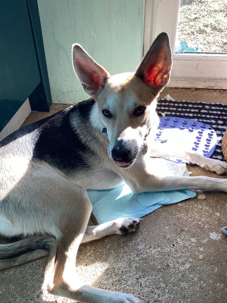 It’s bright and sunny today! I am sitting on the couch a bit more than usual and I’m hoping it won’t be a sign of things to come. I’ve been trying to work out what I can do about the increasing mess and destruction following our rescue T around in his wake. He has destroyed lots of things unfortunately and he is more powerful when out walking than I’d like. A Halti muzzle does help but he hates it, as it restricts his head movement.